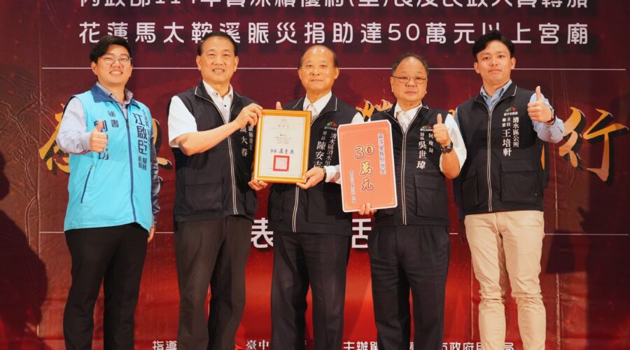 除向基層致敬,民政局也特別感謝7間宮廟於去年花蓮馬太鞍溪堰塞湖溢流災害發生後,主動捐贈50萬元以上善款,協助提升救災量能,其中南屯萬和宮及清水紫雲巖各捐贈200萬元;西屯惠來里福德祠及北區重生堂各捐贈60萬元;南區醒修宮、豐原慈濟宮及北區寶覺寺各捐贈50萬元。民政局指出,宗教團體在災害發生時主動伸出援手,展現回饋社會的正向力量,不僅為災區注入溫暖,也成為政府推動救災工作的有力後盾。