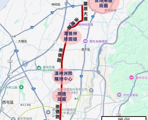 市府捷運工程局長蘇瑞文表示,紅線主線段路廊行經北區、北屯區、潭子區、神岡區、豐原區等行政區,作為串聯服務台中核心與豐原副都心主要路廊之一,沿線服務一中商圈、崇德商圈、漢神洲際購物中心及台鐵豐原車站等,行經眾多重劃區,可提供觀光與基本旅運需求,進而帶動市區觀光及經濟發展,滿足通勤、通學需求。