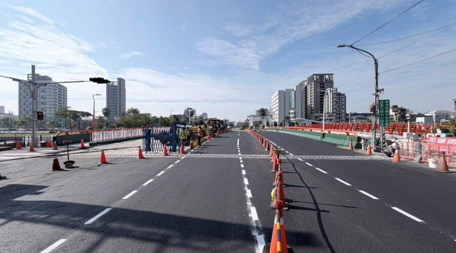 此外,依據交通局智慧運輸中心的數據顯示施工期間在市府團隊的控管下,透過周邊號誌時制動態調整、交控設備布設以及警力站崗,車流狀況維持穩定。其中替代道路海邦橋(鎮海路)往東車流增加20.2%,顯示交通分流成效良好。警察局交通大隊也在施工期間於周邊6處路口安排11名警力、6名義交協助交通疏導,以確保市民受交通影響降到最低。