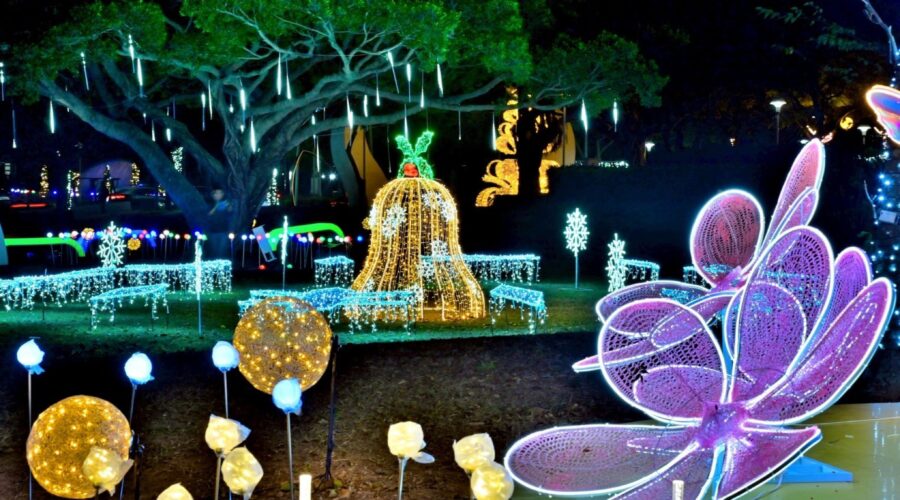 沙鹿區長劉素幸表示,今年燈區以7.5米高主燈「光漾水舞樹」作為迎賓亮點,金黃緞帶結合水舞波紋與律動光束,打造最吸睛的拍照打卡焦點;沿著園區步道,更設置雪花、月影、光瀑布、星光光球等浪漫燈飾,包含「蝶樂光影」、「星泉樹」、「幻光長老」、「光聚琉璃」、「光耀葵田」、「漣漪光影」、「光韻樂徑」等展區,讓遊客漫步其間,彷彿走入冬日童話世界。