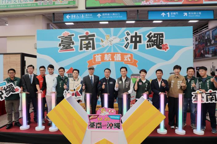 繼台南-熊本航線在前(23)日首航起飛後,每週四、日台南直飛日本沖繩的航線也於今(25)日正式啟航!台南市長黃偉哲今日出席在台南航空站辦理的首航儀式,與許多貴賓及首航旅客齊聚一堂,迎接來自日本的遊客。黃偉哲市長盼望台南國際空航網藉著「台南-沖繩」與「台南-熊本」航線繼續串連,全面打開台南連結日本西南部的重要空中門戶。