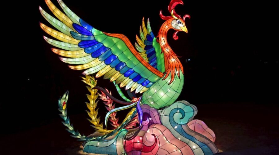 夜幕降臨後,園區內燈光逐漸亮起,柔和燈影與繽紛花海相互映襯,讓高聳的蜀葵花在燈光點綴下更顯夢幻迷人。園區人氣裝置 「西瓜馬車」 以及深受大小朋友喜愛的 「摩斯拉」 主題燈飾及各式花燈,在夜晚燈光映照下更顯亮眼,成為遊客拍照打卡的熱門景點。