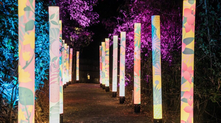 「夜綻之花」模擬峭壁間盛開的花朵,夜晚花蕊亮起後,民眾可輕觸花蕊,變換整串花朵的光影色彩,增添互動趣味;「蝶舞山林」取材大津周邊蝴蝶生態,蝴蝶燈飾沿山道佈置,部份還有動態開闔效果,營造蝴蝶飛舞意象;「文心蘭林」以文心蘭為主題,結合結構裝置與花藝設計,打造可供民眾穿梭其中的花林景觀;「花果天堂」則融合在地植物與水果意象,透過投影與螢光元素,打造必拍的沉浸式光影場景。