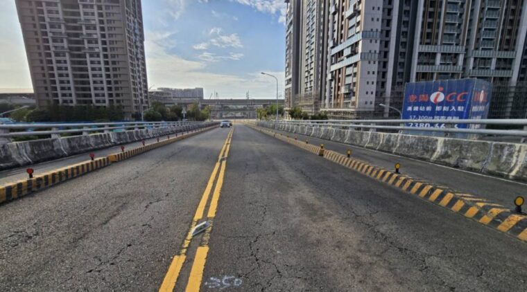 建設局說明,此案改善範圍包含橋梁全長535公尺、寬14公尺,分隔島打除總長約1,070公尺,路面刨封面積約7,490平方公尺,整體改善經費約700萬元。工程完成後,原雙向各一汽車道及一機車道的配置,將調整為雙向各兩個混合車道,可有效提升橋面車輛容納量,達成短期交通疏導目標;同時透過路面刨封更新,並提升道路標線防滑係數至65BPN,全面強化行車安全與路面品質。