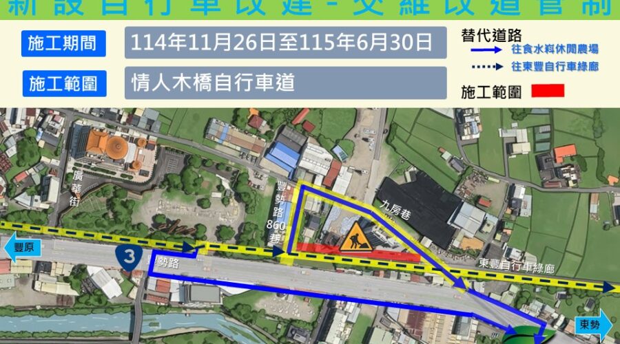 建設局長陳大田表示,「東勢-豐原生活圈快速道路」是大台中高速路網的最後一哩路,盧市長上任後重啟環評推動,並111年10月復工,並以115年東勢石岡段局部通車及118年全線完工為目標積極推動。隨工程將跨越台3線豐勢路施作階段,為順利推動後續工程,相關交通維持計畫已完成核定。東豐自行車綠廊施工期間,遊客可利用施工團隊所規劃替代道路通行,亦可依引導動線前往食水嵙休閒農場作為中繼休憩點。另因懸臂工作車將推進跨越台3線豐勢路,施作期間將局部封閉豐勢路,現場將設置指揮交通之人員加強指揮交通,維護人車安全。