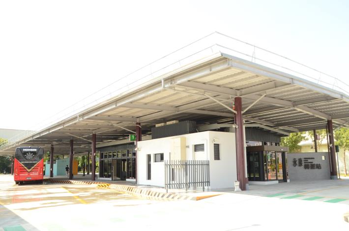 局長王銘德表示,永康轉運站基地面積約0.5公頃,雖受限於土地使用規定,室內建築面積僅約231平方公尺,但仍精心規劃舒適的售票與候車空間,整體設計簡潔俐落,融合太陽能光電棚架與綠色工法,搭配首次採用的「淺鋸齒式月台」,環形車道動線讓國道客運與市區公車整合轉乘更順暢,轉運站上方大型太陽能頂篷不僅遮風避雨,更具備約300kWP的發電量,達成節能減碳目標。
