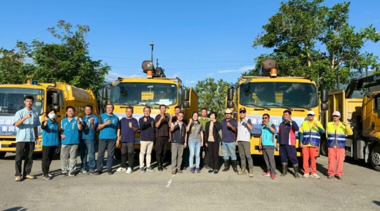 今天支援團隊由臺東縣環保局結合臺東市公所、池上鄉公所、金峰鄉公所、關山鎮公所等單位,動員18人及抓斗車、壓縮式垃圾車、山貓搭配小型運土卡車、高效專業消毒車1輛與一般消毒車等,全面投入花蓮光復災後核心區域的環境整頓與消毒行動,強化災後衛生條件與病媒防治成效。
