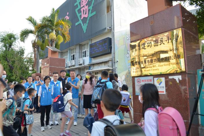 3日上午苗栗縣長鍾東錦、縣議員鄭碧玉、楊明燁、徐筱菁、禹耀東、苗栗市長余文忠、苗栗縣警察局長王森瑒、縣府教育處長葉芯慧等人到苗栗市建功國小關心學童上學情形。