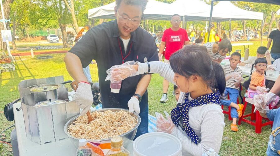 社會處說,市集活動內容多元,其中「粒粒是好米體驗賽」設計為親子合力完成的任務,由家長與孩子共同推動推車前往稻米區,並在限定時間內將稻米裝入穀包,最後依重量計算成果,讓孩子在遊戲中認識農作辛勞,並在合作過程中建立自信與成就感。現場另安排「碰碰爆米香 DIY 活動」,讓不同年齡層的孩子皆能在陪伴下參與,感受傳統飲食文化的樂趣。周邊亦串聯多元市集攤位,營造自在、友善的親子共融空間。