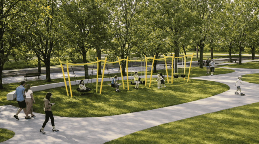 在設計上,園區將保留原有綠地的開放感,讓市民即使身處城市,也能感受到綠意環繞、放鬆身心的慢活氛圍,成為日常生活中的「療癒角落」。公園處進一步說明,為滿足不同年齡層需求,園區北側特別規劃全齡共融遊戲場,集結多樣化遊戲設施,包括共融鞦韆、攀岩遊戲組、磨石子滑梯、木頭攀爬組及搖搖設施等,讓不同年齡、不同能力的孩童都能一起玩、安心玩,實踐友善、安全又包容的遊戲理念。