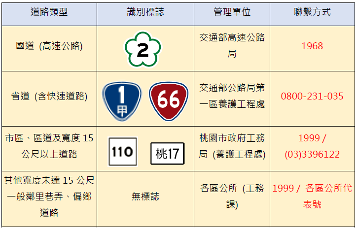 市府工務局表示,若民眾於行車或步行時發現道路坑洞、路面破損或相關設施異常情形,可以參照上圖的「識別標誌」辨別道路類型,並通報管理單位;由於不同道路係由不同機關負責管理,市民若一時間無法辨認,仍可直接撥打1999市民服務專線,由市府協助轉請相關管理機關處理,以加速改善作業。