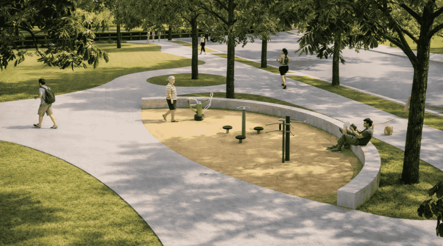 此外,園區南側將設置體健設施區,規劃內容特別考量銀髮族及成人使用需求,配置操作簡單、動線清楚的運動設施,協助民眾進行基礎體能訓練與伸展活動,促進健康生活。同時,也將適度設置休憩座椅與停留空間,提升整體公園使用的友善度與便利性。