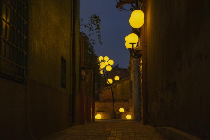 而擅長雕塑和空間裝置的藝術家石孟鑫,常以生活物件拼裝、變形,活用畸零空間,讓物件和空間產生對話。石孟鑫說,這次在魚鱗巷展出《路燈樹》,靈感來自鹽水早年倒風內海的潮汐與風勢,讓許多路樹在歲月中傾斜生長。作品將臺灣家戶常見的黃色門柱燈變形,模擬路樹傾斜生長的姿態,從街角的空隙中伸展,像是在訴說一段被海風推動過的身體記憶。小型的黃球燈則從牆面縫隙與殘痕中生長出來,像是光的果實,在夜間用柔和的光暈染魚鱗巷,讓老巷弄更加迷人。